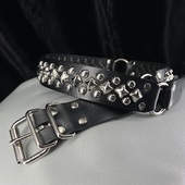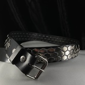 Leather Belts | Fetish Belts These leather belts have a changeable buckle feature, that is almost every belt featured on this website have the buckle attached to the belt by metal snaps which can be opened easily allowing any kind of metal buckle to be placed instead of the standard one. All of Kookie's leather belts come in four sizes, Small, Medium, Large and Extra Large. Size small fits 28-30 inch , medium 32-34, large 36-38 and extra large fits waist 40-42 inch waist |