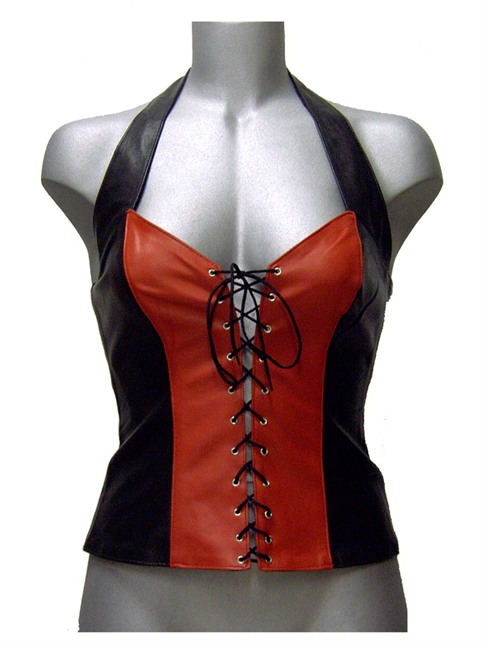 | 4260-35/49 Black and red leather front and back lace up halter top |